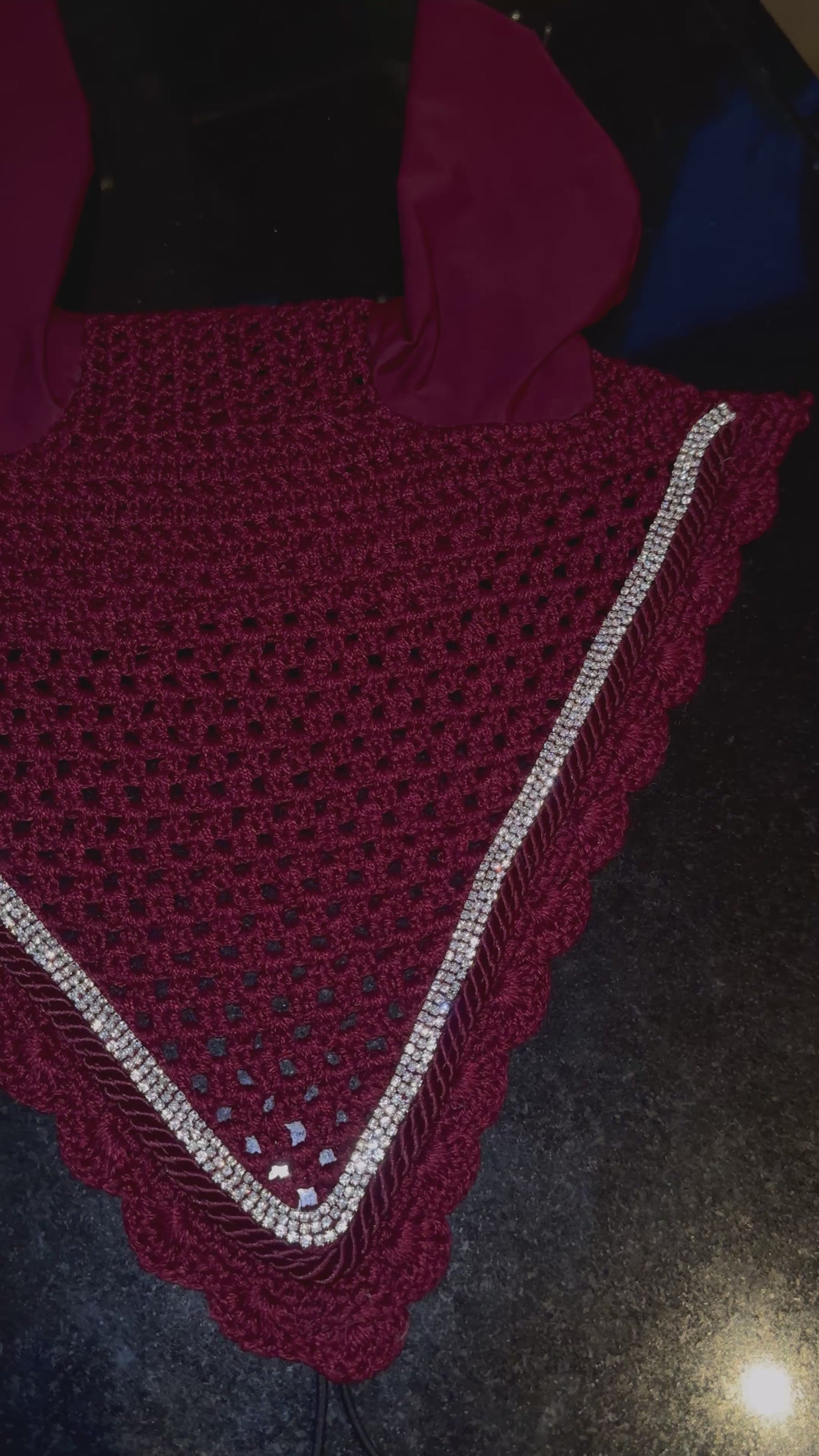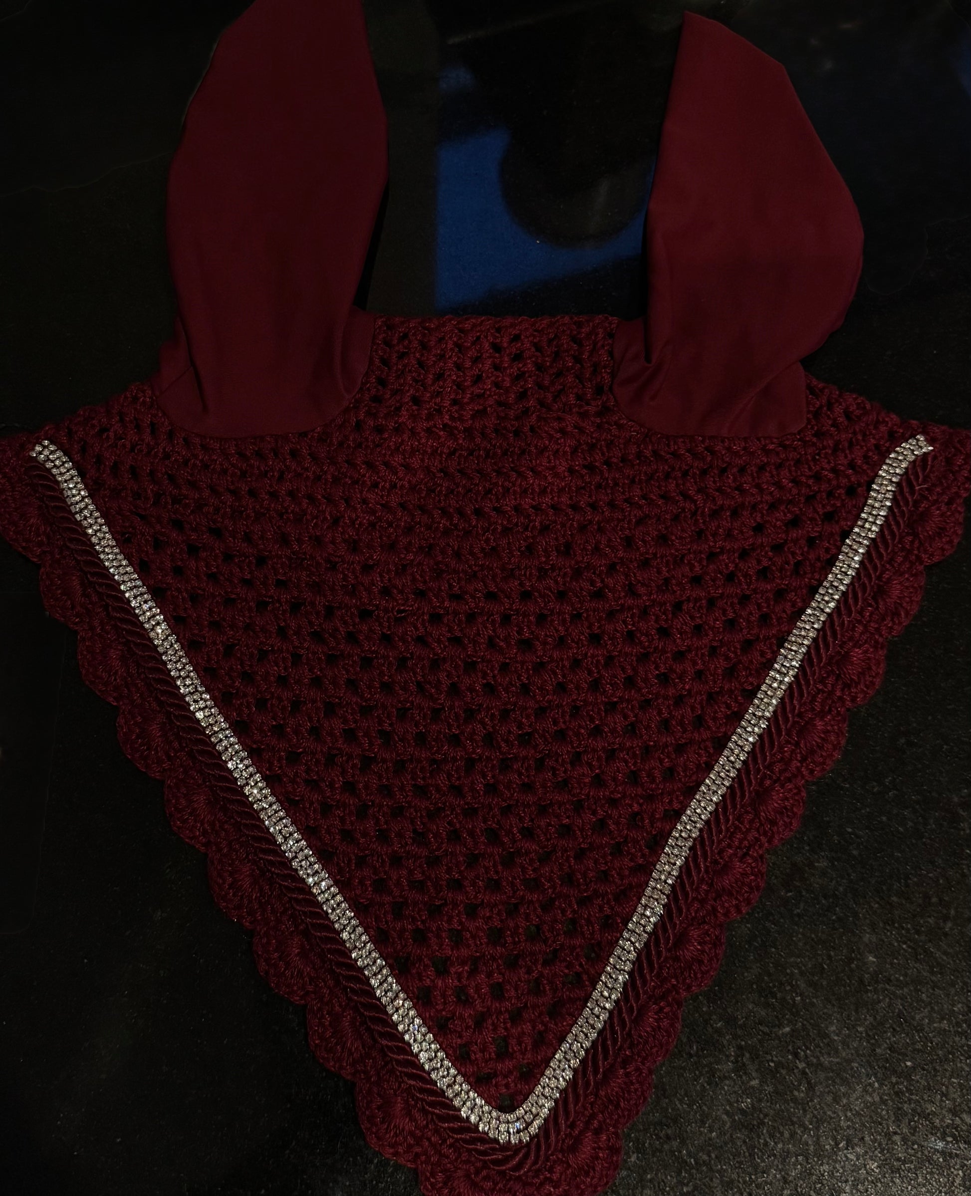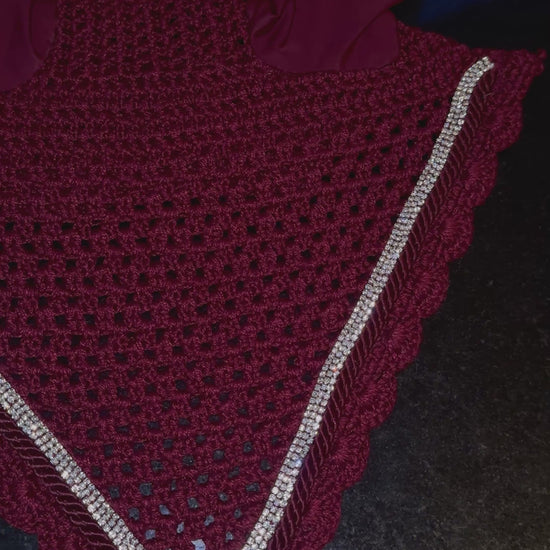 The Burgundy Delite Ear Bonnet brings rich, warm elegance to your horse’s look. Crafted from a deep, hand-crocheted base with smooth, comfortable ears, this bonnet features luxurious burgundy detailing that adds a bold yet refined pop of colour. The shimmer along the trim catches the light beautifully, giving the piece a soft, radiant glow.