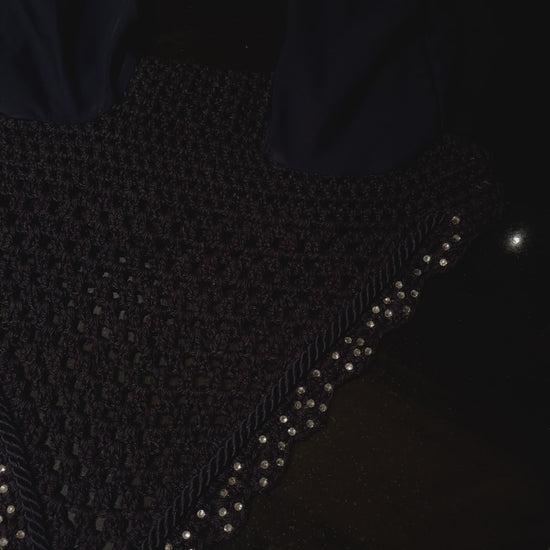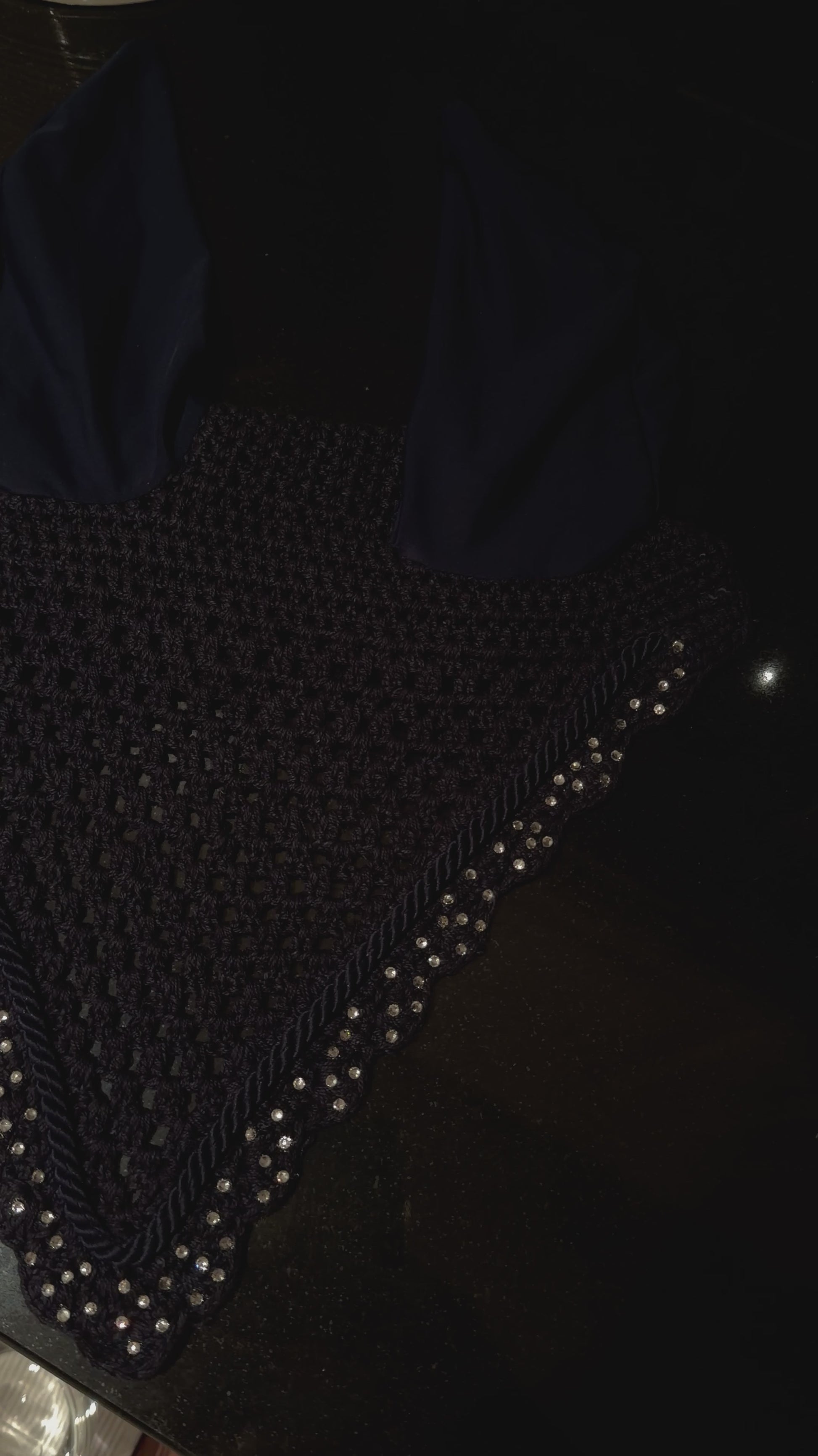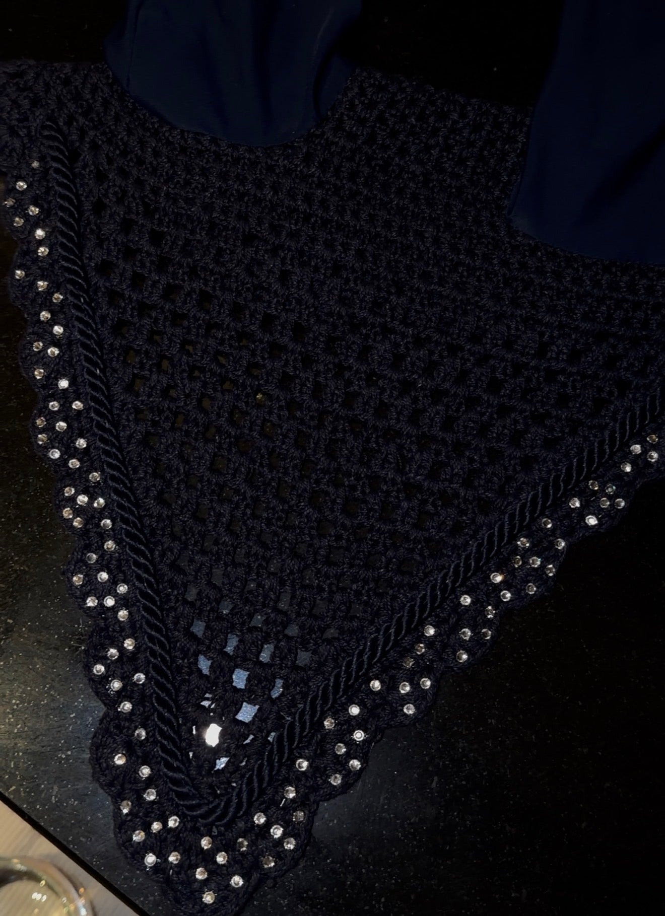 The Midnight Navy Ear Bonnet is handcrafted in a deep navy crochet, finished with refined rope detailing and delicately placed crystals for a subtle yet striking sparkle.